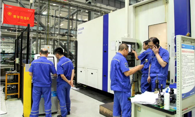 凌晨三點(diǎn)的中國船舶集團(tuán)旗下重慶紅江聯(lián)合廠房,室外,三伏天近40℃的高溫帶來的酷熱并沒有因入夜而降下來;室內(nèi),機(jī)床轟響燈火通明,一號車間最先進(jìn)的三臺臥式加工中心開足馬力全速運(yùn)轉(zhuǎn)。