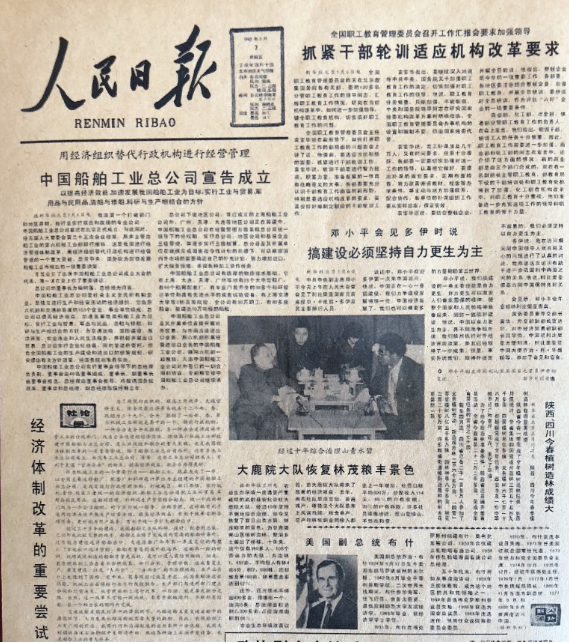 “改革開放是決定當代中國命運的關鍵一招。”1982年5月7日《人民日報》頭版刊載文章:“用經(jīng)濟組織替代行政機構進行經(jīng)營管理——中國船舶工業(yè)總公司宣布成立”,標題下文又著重強調(diào)“以提高經(jīng)濟效益,加速我國船舶工業(yè)為目標,實行工業(yè)與貿(mào)易,軍用品與民用品,造船與修船,科研與生產(chǎn)相結(jié)合的方針”。頭版還發(fā)表了以“經(jīng)濟體制改革的重要嘗試”為標題的“社論”。在這期《人民日報》的頭版還刊發(fā)了鄧小平同志接待外賓時的講話“搞建設,必須堅持自力更生為主”。