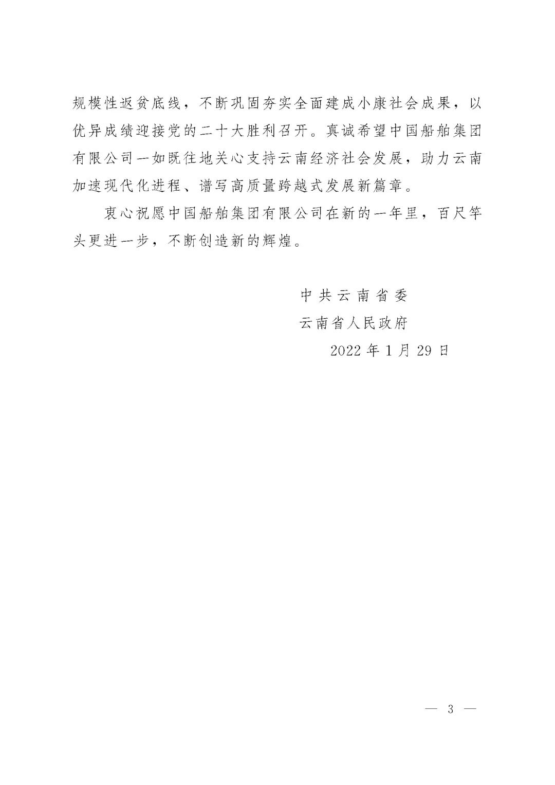 春節前夕,中國船舶集團陸續收到云南省委省政府、文山州委州政府、鶴慶縣委縣政府、勐臘縣政府發來的感謝信,對集團公司長期以來給予鶴慶縣、勐臘縣、丘北縣的傾力幫扶表示衷心感謝和崇高敬意。