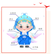 設計說明:該作品取自《山海經》中飛魚——文瑤。相傳文瑤魚出自泰器山,此魚長著魚的身體,鳥的翅膀,飛翔東天門與西天門之上,遨游在東海和西海之間。文瑤魚乃是吉祥如意的象征,相傳其所到之處風調雨順、五谷豐登,船寶設計中加入云紋,如意紋,錢紋寓意中國造船業,吉祥如意,鵬程萬里。海寶以Q版造型生動展現了其活潑可愛、積極熱情服務大眾的美好形象,以文瑤魚的形式化身造船工匠,體現我們造船人求真務實、攻堅克難、開拓創新、拼搏奉獻的精神力量,積極營造正能量。