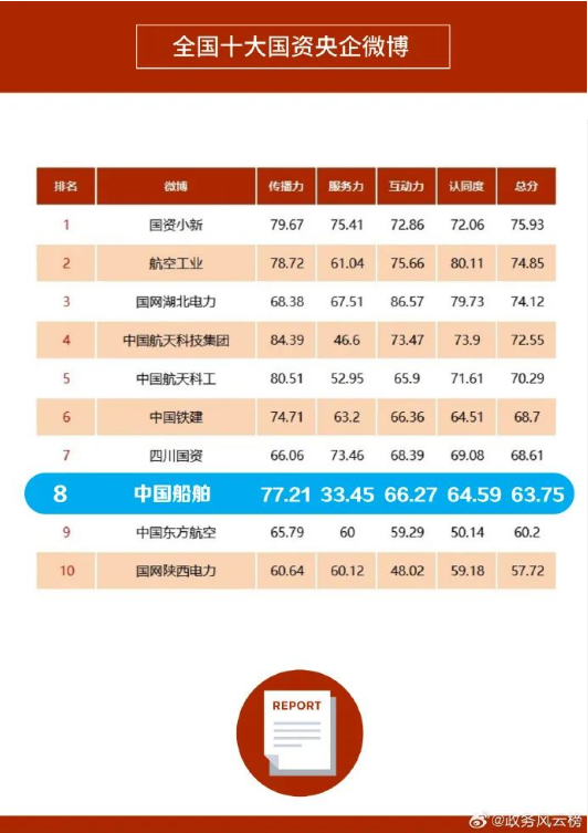 1月31日,由微博出品,人民網(wǎng)輿情數(shù)據(jù)中心、人民網(wǎng)數(shù)據(jù)研究院提供學(xué)術(shù)支持的“2023年度政務(wù)微博影響力報(bào)告”發(fā)布。“中國船舶”微博登上“全國十大國資央企微博”榜單,這是“中國船舶”微博第三次進(jìn)入“全國十大國資央企微博”排行榜。