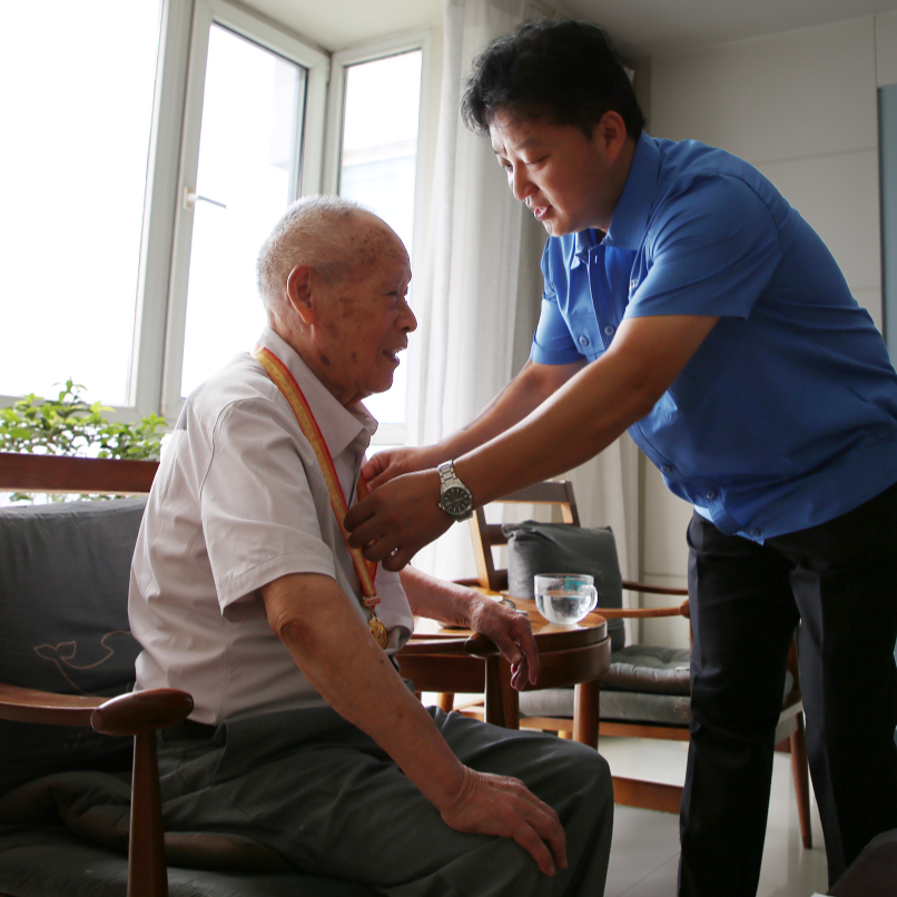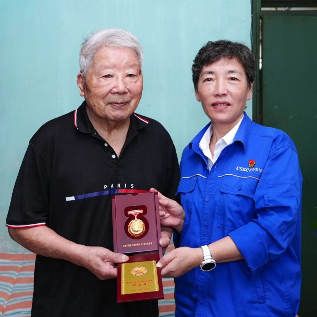 在紀念中國人民抗日戰(zhàn)爭暨世界反法西斯戰(zhàn)爭勝利80周年之際,中國船舶集團有限公司黨組副書記、董事賈海英走訪慰問抗戰(zhàn)老兵焦英杰,頒發(fā)“中國人民抗日戰(zhàn)爭勝利80周年”紀念章,并代表集團公司黨組向他致以崇高敬意和誠摯問候。