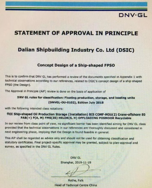 ????11月20日,大船集團在總部舉行了“15.5萬噸穿梭油船”和“通用型FPSO”設計AIP證書頒發儀式,兩型新產品獲得DNV·GL原則性認可。