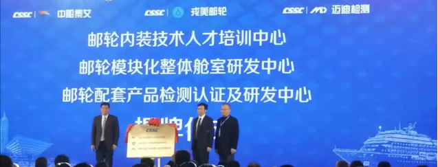 ????為解決我國郵輪配套產(chǎn)品認證難、艙室系統(tǒng)技術(shù)水平落后、專業(yè)人才匱乏等問題,在中船郵輪和中國船舶集團所屬中船九江海洋裝備(集團)有限公司的指導(dǎo)下,中國船舶集團所屬中船集艾郵輪科技發(fā)展(上海)有限公司聯(lián)合中國船級社和上海工程技術(shù)大學(xué)成立了《郵輪配套產(chǎn)品測試認證及研發(fā)中心》、《郵輪模塊化整體艙室研發(fā)中心》和《郵輪內(nèi)裝技術(shù)人才培訓(xùn)中心》,并在會上正式揭牌。