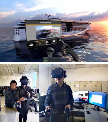 ????該平臺通過總體總師與三維造型師的協同交互,完成全船三維設計(全船造型和艙室內部裝飾等)并搭建逼真場景,用戶通過穿戴智能頭顯,操縱控制手柄,真正實現了“漫步甲板、穿行船艙”的自主漫游體驗。