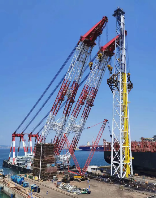 7月7日,世界最大FPSO火炬塔即MV31 FPSO火炬塔在中國(guó)船舶集團(tuán)旗下大船集團(tuán)成功吊裝。MV31 FPSO火炬塔自身總重595噸,總高度140米。由于受到海吊尺寸及吊重能力的限制,經(jīng)過(guò)反復(fù)論證,項(xiàng)目組決定將火炬塔分成兩個(gè)半段吊裝,其中上段高度達(dá)120米,需要整體翻身吊裝。
