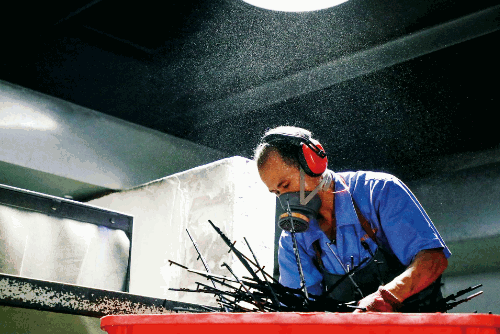 為節約成本,前衛公司碎料工人將廢料放入廢料機,再次回收利用。