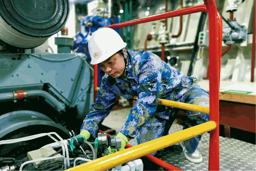 三伏天的機艙悶熱得像個蒸籠,溫度超過50°C。面對突發的主機油壓繼電器故障,七六〇所試驗中心某船輪機長揮汗如雨,迅速排查故障,完成搶修。