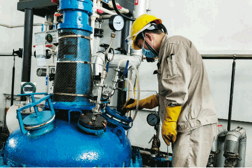 在原料藥車間,七一六所杰瑞藥業(yè)員工細(xì)心查看反應(yīng)釜內(nèi)物料反應(yīng)情況。此時(shí)釜內(nèi)溫度高達(dá)124.8℃,近身溫度超過50℃,全程反應(yīng)時(shí)間約3~4小時(shí)。