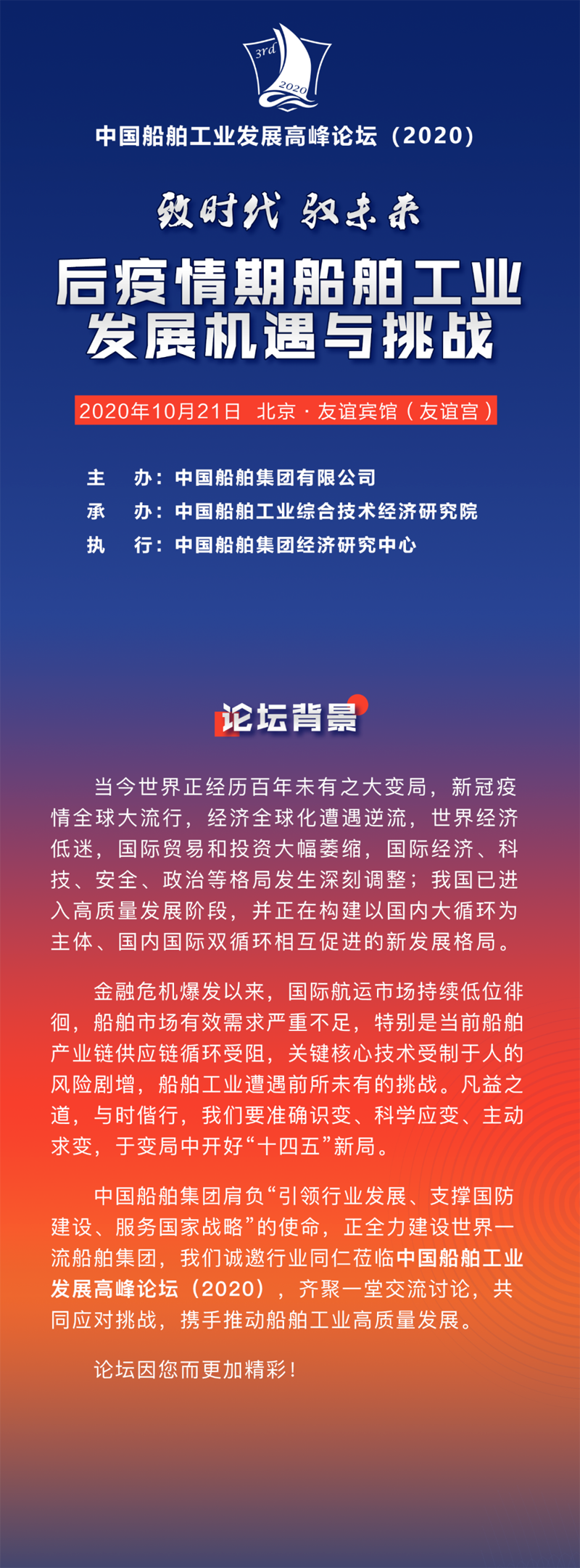 中國船舶集團肩負“引領(lǐng)行業(yè)發(fā)展、支撐國防建設(shè)、服務國家戰(zhàn)略”的使命,正全力建設(shè)世界一流船舶集團,我們誠邀行業(yè)同仁蒞臨中國船舶工業(yè)發(fā)展高峰論壇(2020),齊聚一堂交流討論,共同應對挑戰(zhàn),攜手推動船舶工業(yè)高質(zhì)量發(fā)展。