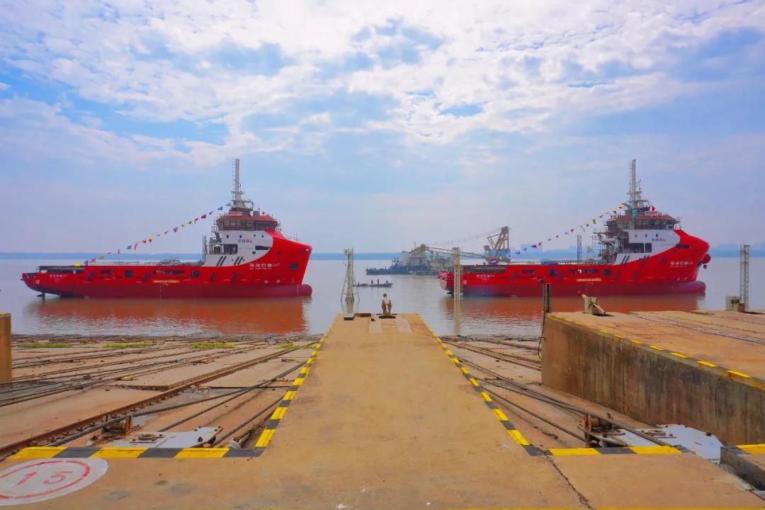10月26日上午,中國船舶集團旗下武船集團為中海油田服務(wù)股份有限公司建造的兩型4000馬力LNG動力守護供應(yīng)船3號船“海洋石油542”和“海洋石油547”下水。