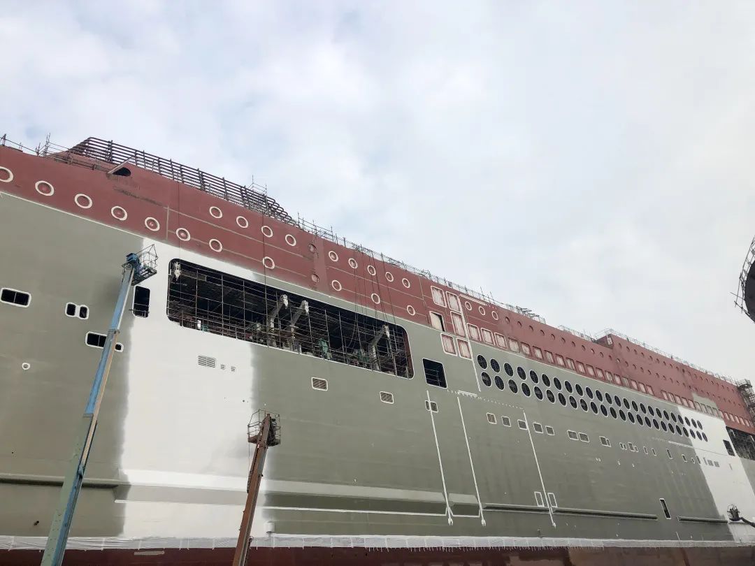 該船實現(xiàn)了出塢前上建亮燈。電纜拉放完成率87.8%,作為全球最大的豪華客滾船,該船全船電纜長度達到了946公里(相當(dāng)于從廣州到重慶);出塢前已完成了830公里電纜的拉放工作。涂裝完整性實現(xiàn)突破,該船出塢時上層建筑上方仍有部分區(qū)域未完成涂裝? 這是因為該船垂直高度已接近40米,超過了船塢高空車的最大極限。