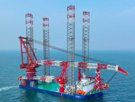 1500噸風電安裝船“藍鯤01”號配備了1500噸繞樁式主起重機,具備20兆瓦等級海上風機安裝作業(yè)能力。其樁腿長度達到了125米,最大作業(yè)水深可達90米,是我國自主研發(fā)設計、具有完全自主知識產(chǎn)權的第四代風電安裝船。