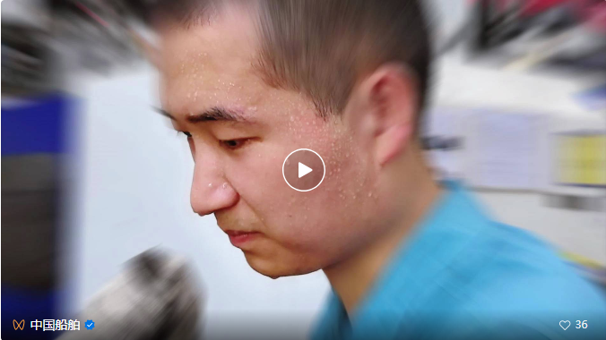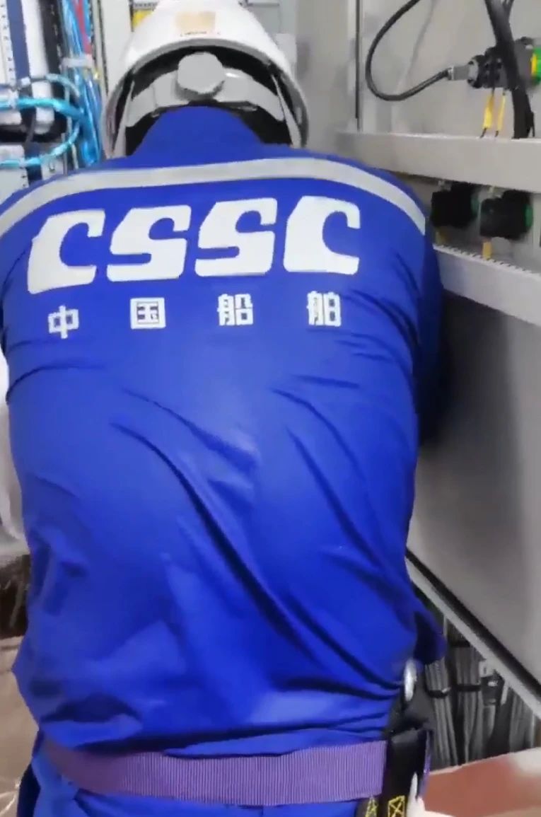 中船發動機——調試人員頂著高溫在認真安裝傳感器,汗水濕透了衣裳。