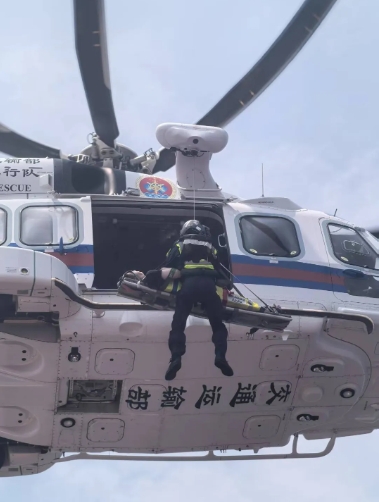 接報后,廣船國際立即啟動航空救援,第一時間聯系海上航空救助和最近的珠海醫院,一場生死競速在南海的碧海藍天間極速展開!在交通運輸部南海第一救助飛行隊、珠海市中山大學附屬第五醫院和試航項目組的通力協作下,半小時后,藍白相間的救援直升機飛臨懸停試航船舶的直升機平臺。