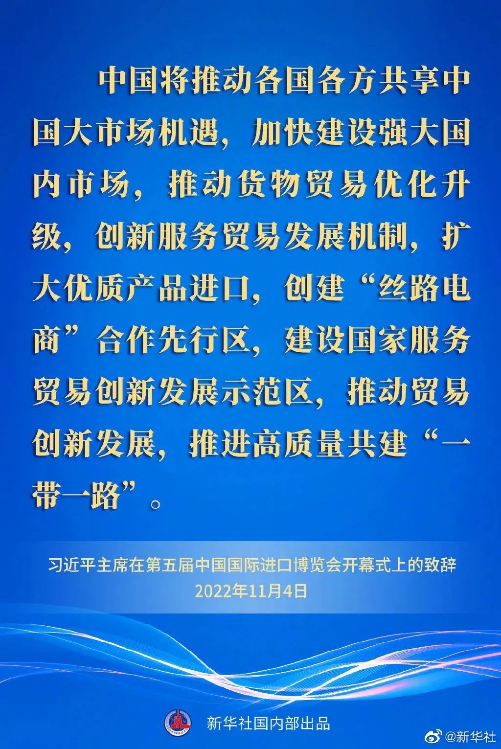 ——中國將推動各國各方共享中國大市場機遇,加快建設強大國內市場,推動貨物貿易優化升級,創新服務貿易發展機制,擴大優質產品進口,創建“絲路電商”合作先行區,建設國家服務貿易創新發展示范區,推動貿易創新發展,推進高質量共建“一帶一路”。
