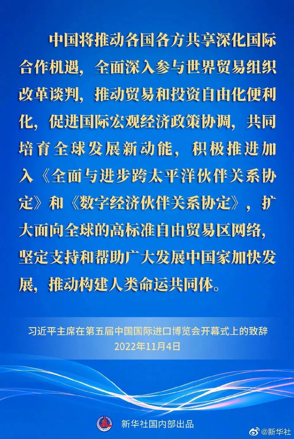 ——中國將推動各國各方共享深化國際合作機遇,全面深入參與世界貿易組織改革談判,推動貿易和投資自由化便利化,促進國際宏觀經濟政策協調,共同培育全球發展新動能,積極推進加入《全面與進步跨太平洋伙伴關系協定》和《數字經濟伙伴關系協定》,擴大面向全球的高標準自由貿易區網絡,堅定支持和幫助廣大發展中國家加快發展,推動構建人類命運共同體。