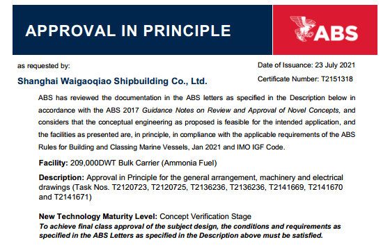日前,中國船舶集團(tuán)旗下外高橋造船自主研發(fā)設(shè)計(jì)的21萬噸氨燃料動力散貨船獲得美國船級社(ABS)頒發(fā)的原則性認(rèn)可證書(AIP)。作為具有潛力的零碳燃料,氨燃料能滿足更加嚴(yán)格的溫室氣體排放要求,是未來脫碳航運(yùn)業(yè)中最有希望的替代燃料之一。氨燃料動力船型的推出,為航運(yùn)業(yè)提供一種零碳運(yùn)輸?shù)沫h(huán)保新方案。