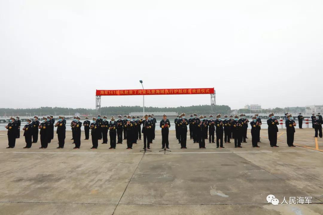 軍樂隊(duì)奏響《歡送進(jìn)行曲》,編隊(duì)艦艇依次解纜,緩緩駛離碼頭,任務(wù)官兵整齊列隊(duì)、士氣高昂,向祖國和人民揮手告別。