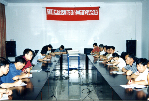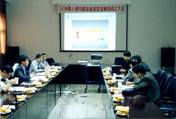 △7000米載人潛水器總體組及總師組成立大會(huì),發(fā)言者為徐芑南。