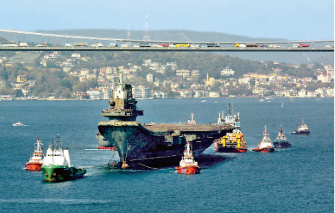 當“瓦良格”號在大批拖輪的前呼后擁下