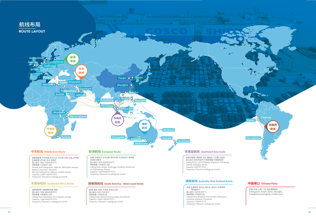 根據客戶需求,中遠海運協同船隊與港口優化航線設置和運力配置,靈活調整全球航線布局,開通中東波斯灣、東南亞、歐洲、墨西哥、中南美洲、非洲等班輪航線,為客戶定制商品車運輸整體解決方案,提供多船型、全程端到端物流服務。