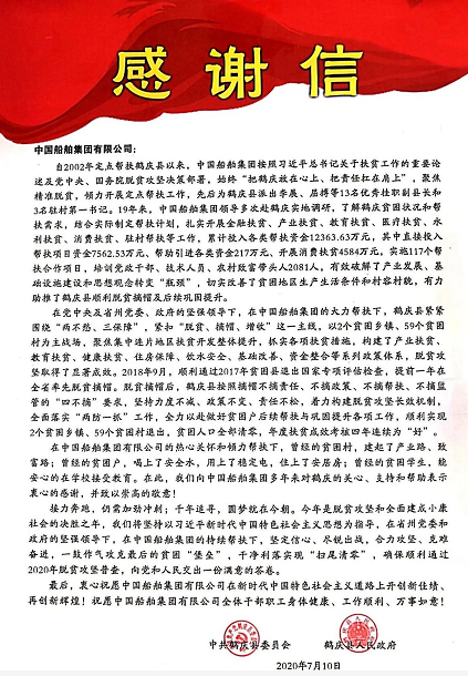 近日,中國船舶集團(tuán)收到了一封來自云南鶴慶的感謝信。從初識(shí)到現(xiàn)在,我們已在脫貧攻堅(jiān)的戰(zhàn)場(chǎng)上,攜手奮戰(zhàn)19載,如今正一鼓作氣攻克最后的貧困“堡壘”。
